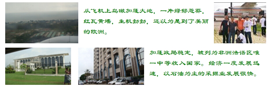 從飛機(jī)上鳥瞰加蓬大地,一片綠郁蔥莽,紅瓦黃墻,生機(jī)勃勃,還以為是到了美麗的歐洲。加蓬政局穩(wěn)定,被列為非洲法語區(qū)唯一中等收入國家。經(jīng)濟(jì)一度發(fā)展迅速,以石油為主的采掘業(yè)發(fā)展很快。加蓬年平均氣溫26℃,擁有豐富的森林資源,森林面積占全國土地面積的85%,被譽(yù)為非洲的“綠金之國”。加蓬的氣候很適宜植物的生長,美麗的出產(chǎn)的蔬菜瓜果品種繁多,真稱得上花朵,絢麗而多姿。加蓬副總理兼外長(現(xiàn)為“非洲聯(lián)盟”主席)為項目舉行慶祝酒會。大家合影留念。加蓬翁布埃市政公路經(jīng)援項目經(jīng)理部全體人員在駐地合影留念。派到加蓬的工程師正在用精密的測量儀器對道路進(jìn)行勘測。正在進(jìn)行緊張的施工,正在使用壓路機(jī)對路面進(jìn)行平整站在自己修建的馬路上,別有一翻滋味在海邊一處施工工地現(xiàn)場。